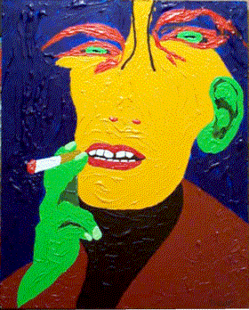 Celine Listening. H24in x W19in (H61cm W48cm) Dated 28-12-97 Price £200, $280 Acrylic on Hardboard with integral frame. delivery extra From a Photo by Margaret The trouble with realism is it limits your unfettered use of colour. This has been brought home to me during the painting of "A Good Deal Done" Margaret my daughter had taken a very atmospheric snapshot of a friend smoking a cigarette. When I saw it I had to paint my impression of it so I stuck it up in my studio and kept coming back to it and staring at it until I knew what Iwanted to say. The result was what I wanted. This is a new departure for me and also when I had finished it reminded me of the technique I was using when I reached the end of my London period. I will be doing a lot more work like this. |