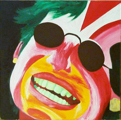 Wales) H24 x W24 inches 61cm x 61cm Dated 4-12-95 Price £300 $435 with integral frame Acrylic on hardboard During the trauma of her divorce, the press hounded Diana even more unmercifully than usual. This painting is derived from a photo in Hullo dated 19-8-95 and catches Diana in a sombre and angry mood. |