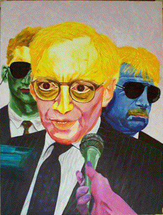Fame H48in W36in (H122cm W91cm) Dated 22-1-96 Price £500 $700 Acrylic on hardboard From a Photo by Popperphoto in TheFinancial Times of 18-9-95 I liked the contrast between Malcolm seemingly relaxed and busy talking to reporters whilst in the background two cold looking, hard faced bodyguards provide him with steely protection. I would not wish to be incarcerated with them, conversation would be very limited. I liked the opportunity to express through colour, the warmth which Rifkind radiates to the press, whereas the guards are portrayed coldly, impassively protecting him. |