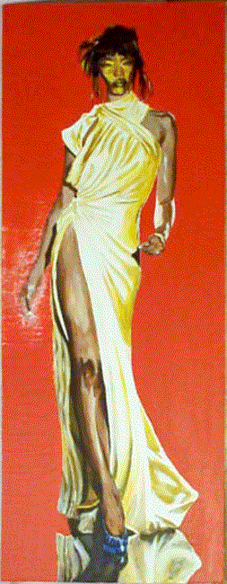 Naomi Campbell H48in W18in (H122cm W46cm) Dated 28-6-97 Price £300 $420 Acrylic on hardboard From Hullo dated a few months before. I get fed up of reportage. Sometimes you just want to paint something because it looks nice. The fashion photo of Naomi was so perfect, so sleek, the dress so beautifully draped that, it had to be painted. This is a case where the painter is unworthy of mention and perhaps should not tamper with the original. The photographer is the superior creator but he had to have the right material. The dress designer has to be the best of the three and what about the model as artist. She had to know how to hang the clothes on her body for them to look so perfect. That is teamwork. The onlooker can only appreciate and enjoy such a creation which I did in painting it. |
