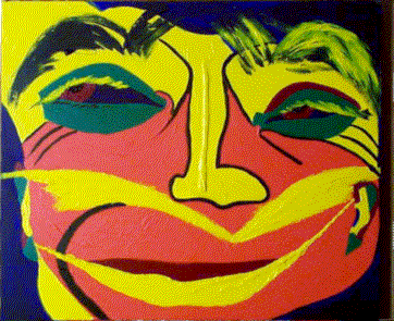 Richard Beaming. H20 x W24 inches. 51cm x 61cm Dated 7-1-98 Price £100 $140. Acrylic on hardboard From a photo by Margaret The semi-abstract art form frees you to paint a mood free of the disciplines of strict and accurate realism. Richard had a wide, contented smile assisted by some festive spirits at Christmas. The bright colours express his light and happy mood. |