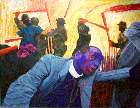 Die Where Fools Fear Not To Kill. H48in x W63in (H122cm W160cm) Dated 24-11-97 Price £4000 $5600 Acrylic on reinforced hardboard with integral frame From two P.A. News photos and some imagination. The scene is Kenya during the repressive riots against the rule of Daniel arap Moi. The Priest, Timothy Njoya, appalled at the carnage about him when people who were trying to express their disaffection with the regime were being beaten insensible or shot down like vermin, stood between them and the riot police. So they beat him up to the point when he feared for his life (he survived). Technical detail: The inspiration came from my disturbance and dismay at a photo of the priest and helpers by an Associated Press photographer which appeared in the The Times of July 8, 1997. The original photo had a pleasant grassy background but I needed some more atmosphere so used the police thugs from another photo of the political protests in Kenya, to emphasise the violence. That photo was also supplied by A.P. I combined them digitally. |